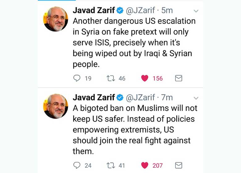 ظریف در توییتر: ممنوعیت ورود مسلمانان، آمریکا را امن نمیکند/ تنشافزایی آمریکا در سوریه کمک به داعش است