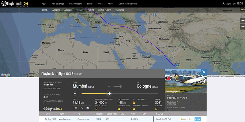 عبور هواپیمای بوئینگ ۷۴۷ شرکت آمریکایی UPS با علامت ثبتی N570UP از آسمان کشورمان – ۲۳ مردادماه ۹۷