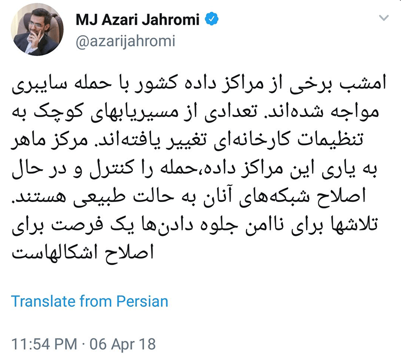 وزیر ارتباطات در توئیتر خود از حمله به مراکز دادهای و دیتاسنترهای کشور خبر داد.