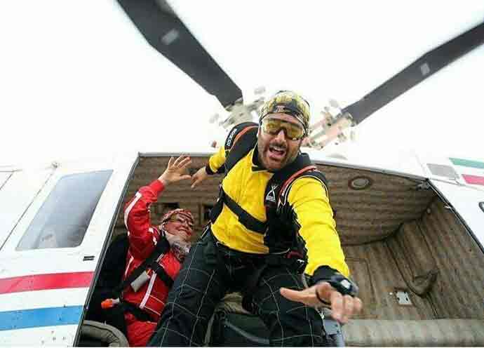 عکسی از محمدرضا گلزار در حال پریدن از یک بالگرد را مشاهده می کنید.