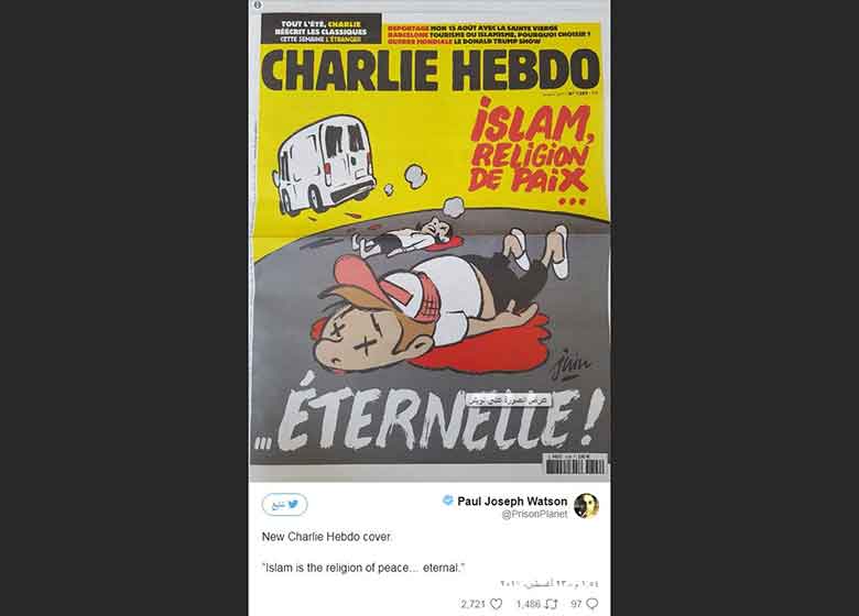 هفته نامه شارلی ابدو چاپ فرانسه دیروز چهارشنبه در اولین صفحۀ خود کاریکاتوری درباره حملۀ تروریستی چند روز پیش بارسلون منتشر کرد که نشان می دهد ۲ کشته روی زمین افتاده است و جمله ” اسلام دین صلح ” است، بالای صفحه دیده می شود. کلمه ” برای همیشه” هم زیر صفحه نوشته شده است.