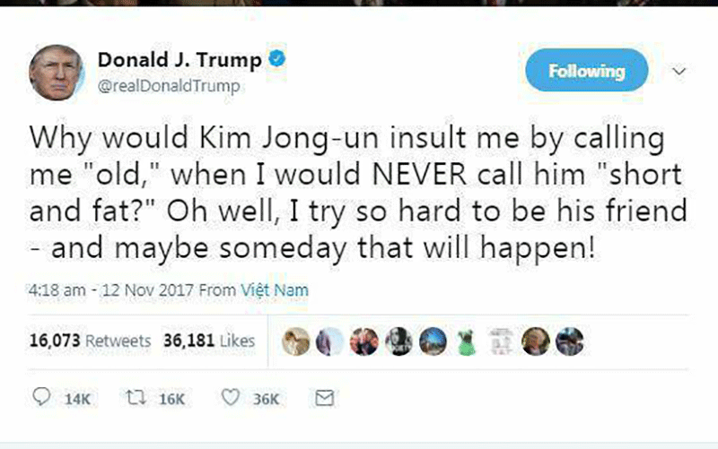 او همچنین در بسیاری از توئیتهای خود به جدال لفظی به کیم جونگ اون پرداخته و او را با القاب مختلف نام برده است. مرد موشکی، مرد چاق یا خیکی و از این دست نمونه های آن بوده است. او در یکی از توئیت هایش نوشت: «چرا کیم جونگ اون توهین میکند و من را پیر میخواند، در حالی که من هرگز به او “کوتوله خیکی” نمیگویم. من خیلی تلاش میکنم با او دوست شوم، شاید هم روزی این اتفاق بیفتد».اما در نهایت این اتفاق نیز افتاد. سخن از دیدار ترامپ و کیم جونگ اون یکی دیگر از شگفتی های دوره حکومت ترامپ بود.
