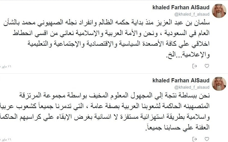 شاهزاده خالد بن فرحان چندی پیش گفته بود بعد از ظلم و ستم صورتگرفته علیه پدرش خاک عربستان را ترک کرده و از بیم بازداشت شدن از سوی مسئولان سعودی در آلمان اقامت گزیده است.