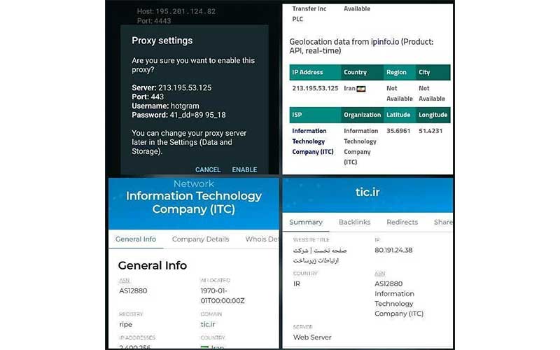 وی خاطرنشان کرد: طبق تصویر زیر یکی از هزاران پراکسی برای دور زدن فیلترینگ تلگرام و با نام هات‌گرام به‌صورت رسمی از سوی تلگرام به افراد معرفی می‌شود که با بررسی IP آن به سرورهای شرکت زیرساخت به‌عنوان تأمین‌کننده این پراکسی می‌رسیم.