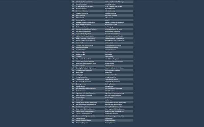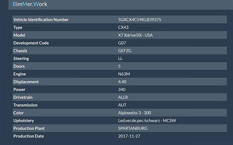 همانطور که در تصاویر مشخص است، این کد شناسایی مربوط به مدل XDrive50i به رنگ سفید آلپ و مجهز به پیشرانهی هشت سیلندر V شکل ۴.۴ لیتری توئین توربو است. قدرت این پیشرانه ۳۴۰ کیلووات درج شده است که حدود ۴۵۶ اسب بخار خواهد بود؛ علاوه بر این X7 دو دیفرانسیل است و از جعبهدندهی خودکار و احتمالاً هشت سرعته استفاده میکند.