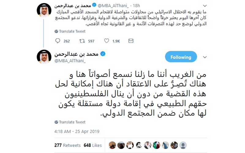 «محمد بن عبدالرحمن آل ثانی» وزیر خارجه قطر تأکید کرد که اقدامات رژیم صهیونیستی برای یورش مداوم به مسجدالاقصی، نقض آشکار معاهدات و قطعنامههای بینالمللی است.