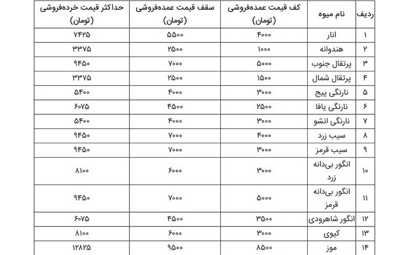 به هر حال اتحادیه فروشندگان میوه و سبزی قیمت ۱۴ میوه را تعیین کرده و برای آنها کف قیمت و سقف قیمت مشخص کرده است و هرکس این قیمت را رعایت نکند جریمه میشود.