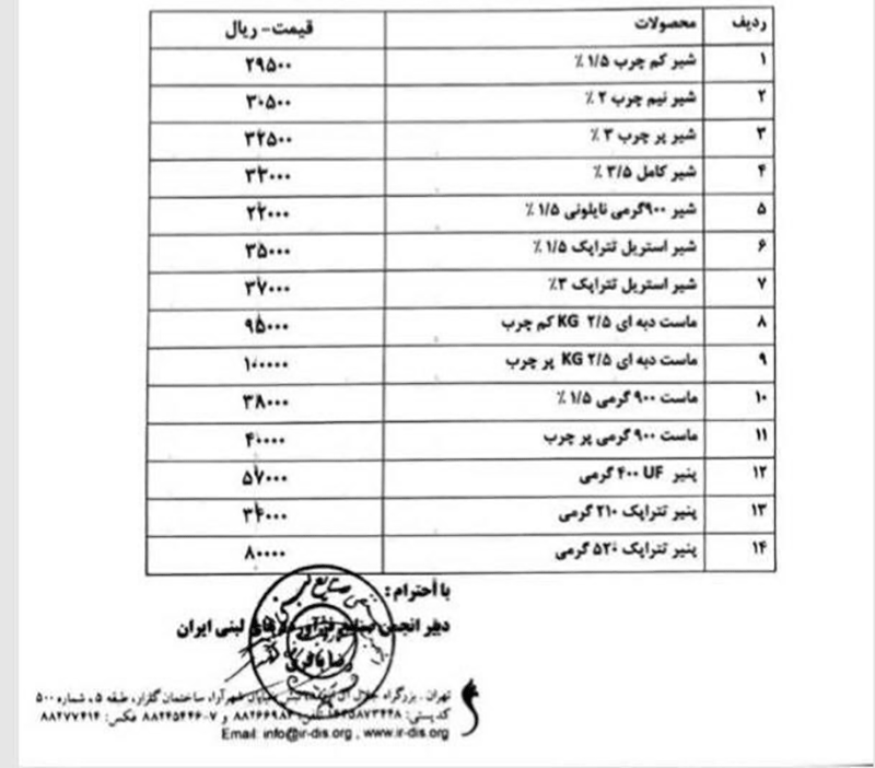 به طور مثال نرخ (مصوب ) شیر پرچرب یک لیتری (۳ درصد چربی) از ۲۸۰۰ تومان به ۳۷۰۰ تومانی افزایش یافته است.