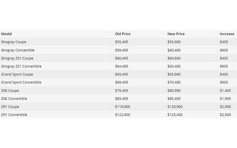 CorvetteBloggger به نقل از یکی از بزرگترین نمایندگی کوروت در دنیا نوشته که قیمت کوروت ۲۰۱۹ بسته به نسخهی انتخابی تا ۲۵۰۰ دلار افزایش یافته است. مدل پایهی استینگری کوپه کمترین افزایش قیمت را داشته و بهای آن از ۵۵۴۹۵ به ۵۵۹۰۰ دلار رسیده که حاکی از افزایش قیمت ۴۰۵ دلاری است.