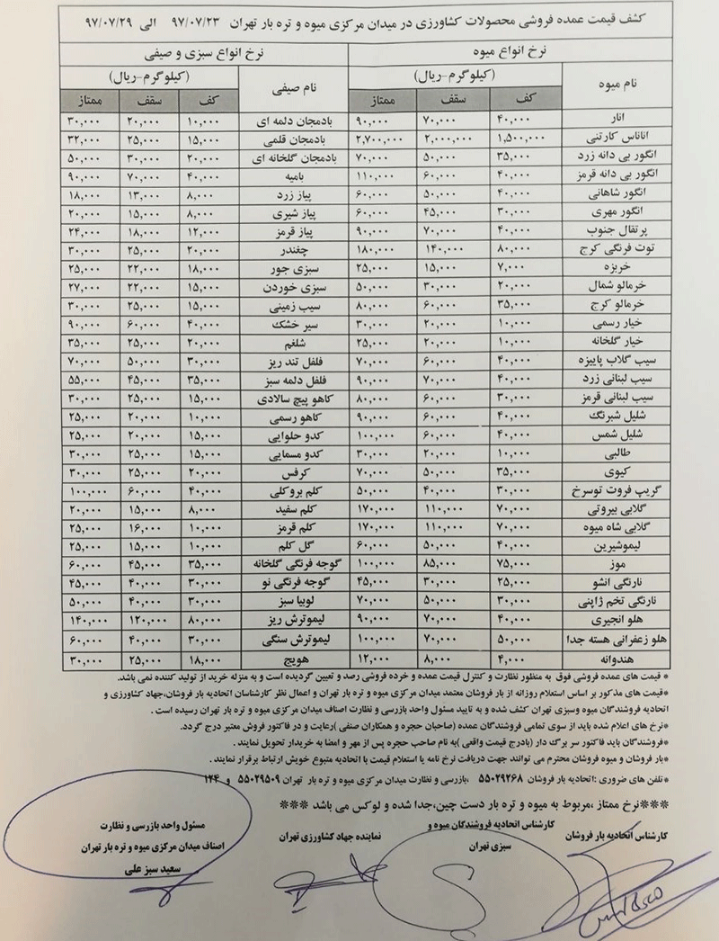 قیمت جدید عمده فروشی انواع میوه و صیفی در تهران که حاصل تصمیم مشترک جهادکشاورزی استان تهران، بازرسی میدان مرکزی و اتحادیه‌های بارفروشان و فروشندگان میوه و تره بار است، اعلام شد.