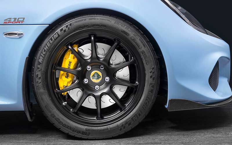 اگزیج اسپرت ۴۱۰ از لاستیکهای میشلین پایلوت اسپرت کاپ ۲ همراه با رینگهای فوق سبک و دستساز با رنگ سیاه و نقرهای استفاده خواهد شد. برای بهبود ترمزگیری خودرو نیز کالیبرهای ترمز چهار پیستونی AP Racing در ترکیب با دیسکهای ترمز دوتکه J-hook بکار گرفته شدهاند.