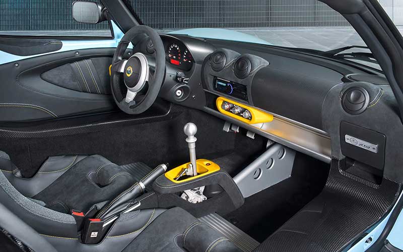 در فضای داخلی، فرمان آلکانترا و صندلیهای اسپرت فیبر کربن لوتوس را پیدا خواهید کرد، که با تریم چرم خالص؛ یا آلکانترا و چرم همراه با دوخت متضاد عرضه میشوند. پکیج رنگ داخلی در قسمتهای مختلف مانند محفظههای سیستم تهویه مطبوع، قاب پنجره الکتریکی و کنسول مرکزی با رنگهای متضای ارائه خواهند شد. دیگر گزینهها شامل سیستم تهویه مطبوع، قابلیتهای آیپاد (ipod) و بلوتوث است.