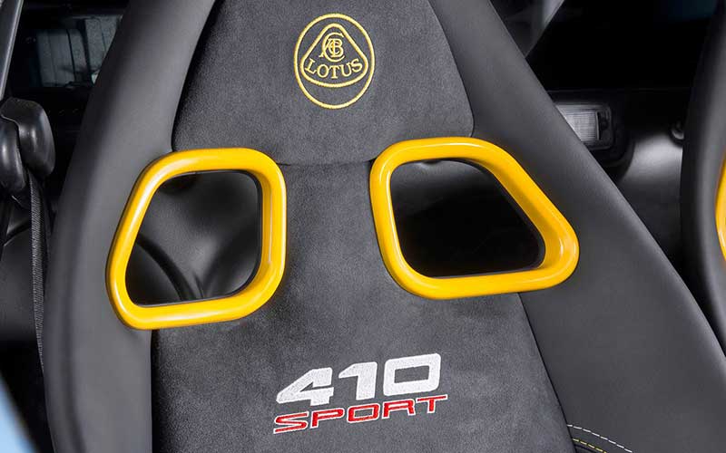 لوتوس برای کمک به کاهش وزن خودروی اسپرت ۴۱۰، یک سیستم اگزوز کاملا تیتانیومی اضافه کرده است که ۱۰ کیلوگرم از وزن خودرو را کم میکند تا به وزن قابل ملاحظه ۱۰۵۴ کیلوگرم برسد. برند بریتانیایی زیر مجموعه جیلی، برای تعدادی از اجزای قابل مشاهده مانند پوشش پادری، سقف، تجهیزات داشبورد و سپر خودرو از قطعات فیبر کربن بهره میگیرد.
