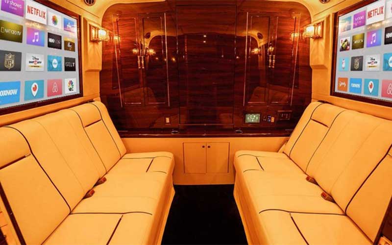 Lexani G-77 به یک دفتر کار لوکس متحرک شباهت دارد که براساس شاسی پیکاپ سنگین فورد F-550 ساخته شده است.