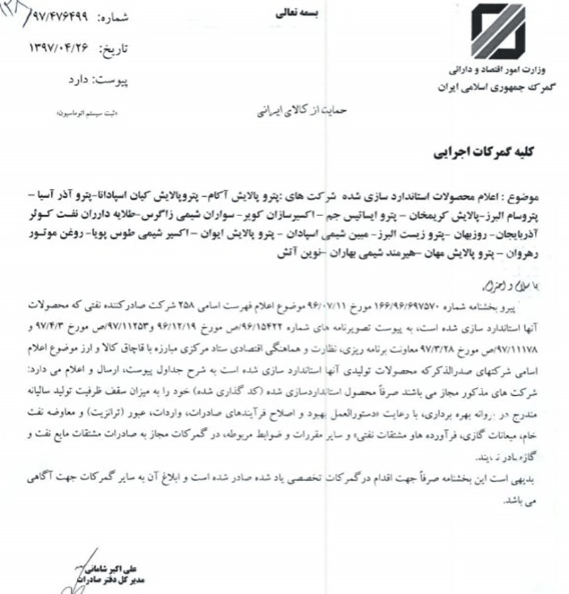 فهرست جدید شرکت های صادرکننده فرآورده های نفتی که محصولات آنها استاندارد سازی شده است را به کلیه گمرکات اجرایی اعلام شد.