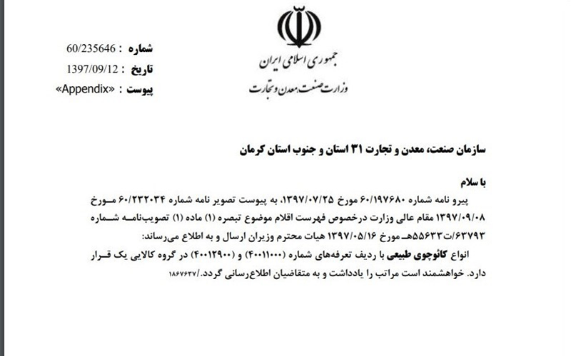 به گزارش تسنیم ، وزارت صنعت، معدن و تجارت با ارسال نامه ای به سازمانهای خود در استانها نوشت: براساس تصویب هیئت وزیران و نامه مقام عالی این وزارتخانه، واردات انواع کائوچو طبیعی در گروه یک اولویت ارزی برای واردات، قرار دارد.