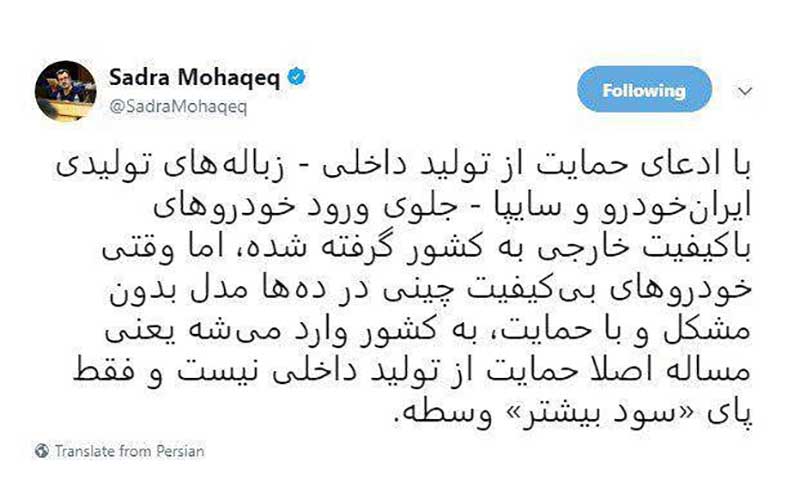 صدرا محقق از خبرنگاران روزنامه شرق در توییتر خود با لحنی تند از سیاست های دولت در زمینه ساماندهی بازار خودرو انتقاد کرد و نوشت: