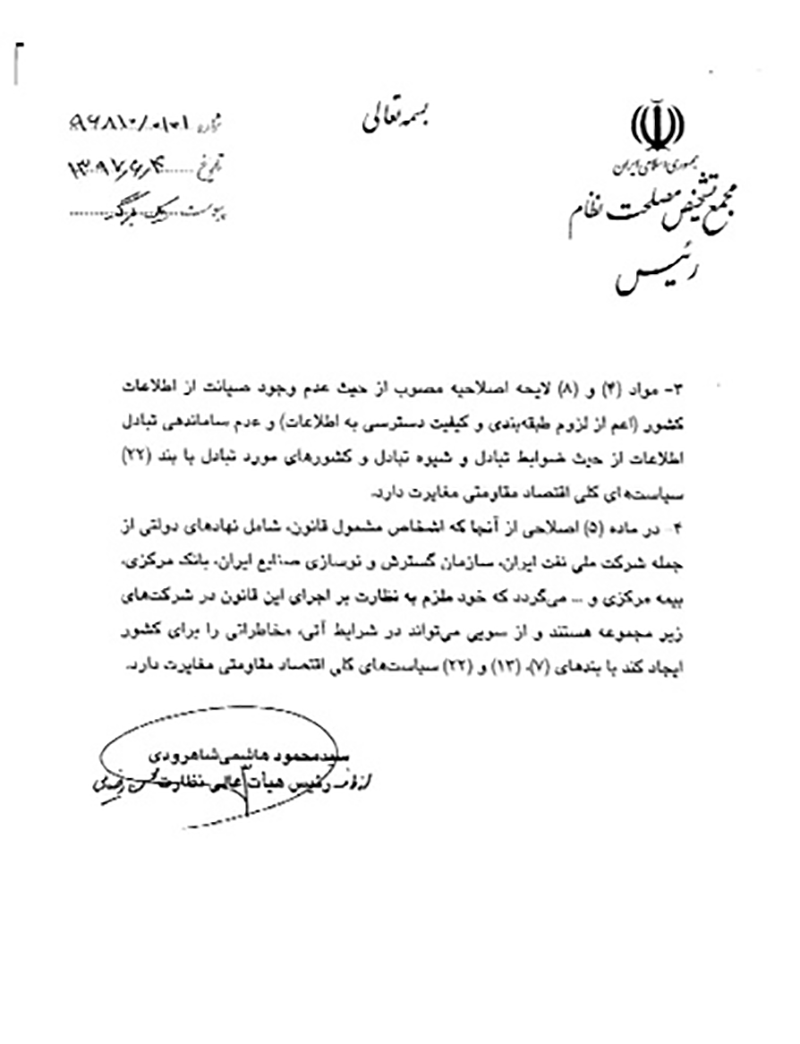 به گزارش انتخاب، آیت الله محمود هاشمی شاهرودی، رئیس مجمع تشخیص مصلحت نظام با ارسال نامه ای به شماره ۰۱۰۱/۹۶۸۱۰ در تاریخ ۴ شهریورماه به آیت الله احمد جنتی، دبیر شورای نگهبان، مغایرتهای یکی دیگر از لوایح چهارگانه درخواستی FATF یعنی لایحه اصلاح قانون مبارزه با پولشویی با بندهای ۷، ۱۳ و ۲۲ سیاست های کلی اقتصاد مقاومتی، بندهای ۱ و ۱۱ سیاست های کلی تشویق سرمایه گذاری، بند ۱ سیاست کلی امنیت قضایی و بند ۱۴ سیاست کلی امنیت اقتصادی را اعلام کرد.