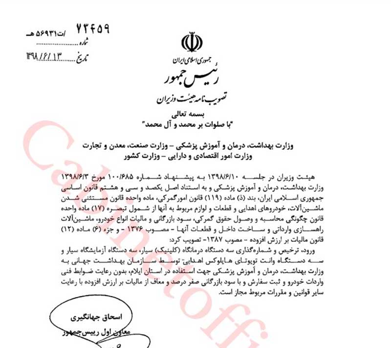 هیأت وزیران ورود، ترخیص و شمارهگذاری سه دستگاه درمانگاه (کلینیک) سیار، سه دستگاه آزمایشگاه سیار و سه دستگاه وانت تویوتای هایلوکس اهدایی سازمان بهداشت جهانی به وزارت بهداشت، درمان و آموزش پزشکی جهت استفاده در استان ایلام را مجاز دانست.