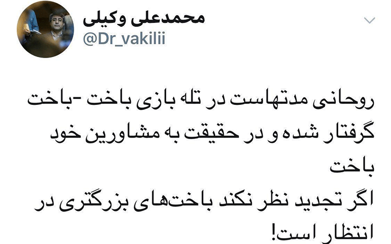 محمد علی وکیلی نماینده تهران در توییتر خود نوشت: روحانی مدتهاست در تله بازی باخت -باخت گرفتار شده و در حقیقت به مشاورین خود باخت. اگر تجدید نظر نکند باختهای بزرگتری در انتظار است.