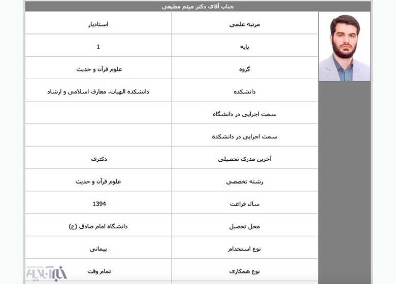 تصویر زیر مربوط که اطلاعات علمی میثم مطیعی در سایت دانشگاه امام صادق