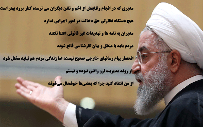 حسن روحانی: مدیری که در انجام وظایفش از اخم و تلفن دیگران می ترسد، کنار برود بهتر است. اگر به جای تهدید، مردم را قانع کنیم؛ در هر مشکل داخلی و خارجی موفق خواهیم شد. انقلابی بودن، یعنی حل گرفتاری و کسب رضایت مردم. هیچ دستگاه نظارتی حق دخالت در امور اجرایی ندارد. مدیران به نامه ها و تهدیدات غیر قانونی اعتنا نکنند. مردم باید با منطق و بیان کارشناسی قانع شوند. انحصار پیام رسانهای خارجی صحیح نیست، اما زندگی مردم هم نباید مختل شود. از روند مدیریت ارز راضی نبوده و نیستم؛ بانکها و حواله باید محور باشد