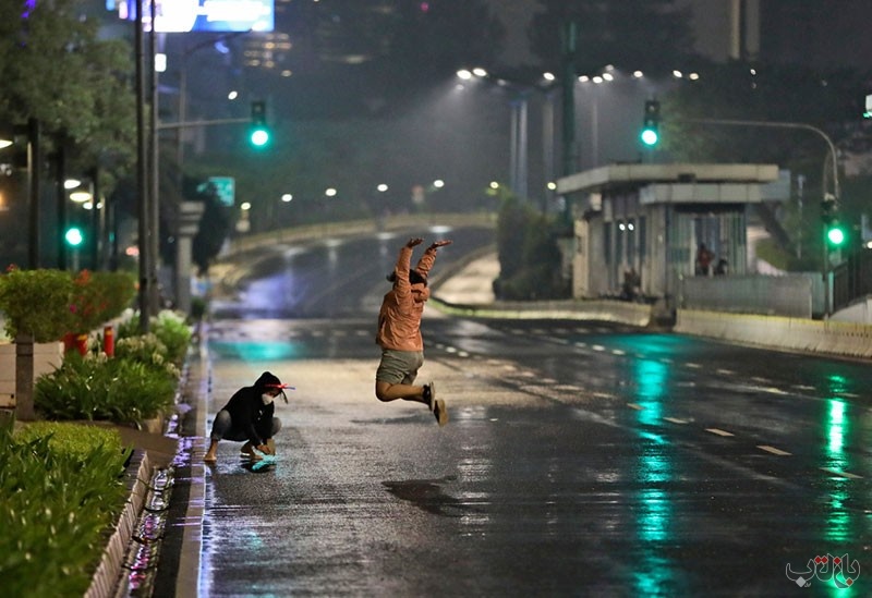 پرش یک زن در شب سال نو در خیابان خالی در جاکارتا