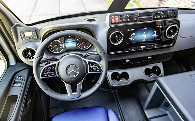 مینی باس اسپرینتر به جدیدترین سیستم مولتی مدیای مرسدس بنز که MBUX نام دارد مجهز شده است. به این ترتیب دیگر نیازی به کلیدهای چرخان و فشاری کار نیست؛ چراکه بیشتر کارها با استفاده از یک صفحه ی لمسی بزرگ انجام میشود. رابط کاربری این سیستم مولتی مدیا، تصویر دوربین دید عقب و دید ۳۶۰ درجه نیز نمایش میدهد. بخش مخصوص راننده و همچنین قسمت سرنشینان در اسپرینتر مینی باس جدید دارای سیستم تهویههای جداگانه هستند.