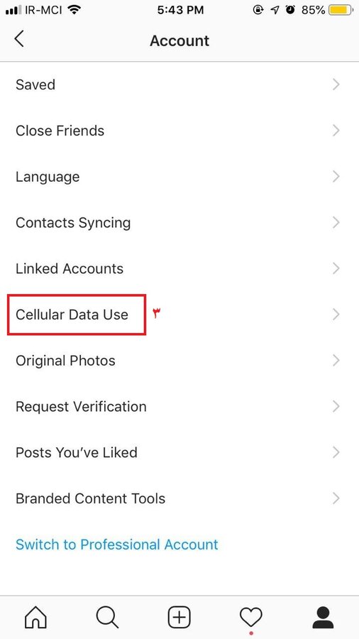 پس از این‌که گزینه Account را انتخاب کردید، وارد Cellular Data Use شوید و گزینه Use less data را فعال کنید. (در برخی گوشی‌ها گزینه data saver نمایان است؛‌ آن را انتخاب کنید.)