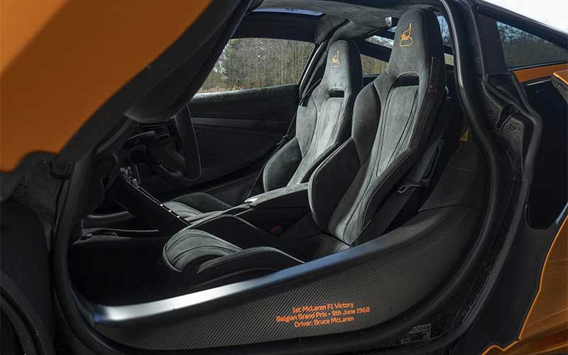 در مقابل رنگ نارنجی روشن بدنه، رینگ‌های سفارشی ۵ پره دوبل هم با رنگ مشکی به چشم می‌خورند. همین تضاد بیشتر را می‌توان در کابین دید جایی که دوخت‌های نارنجی مک لارن روی صندلی‌ها، پانل درب‌ها و کنسول مرکزی دیده می‌شوند.