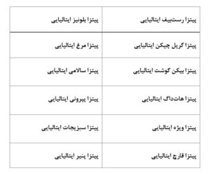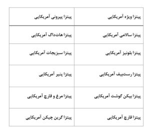 در ادامه ما لیست منوی یکی از شعبههای پیتزا پیتزا را برایتان قرار میدهیم: