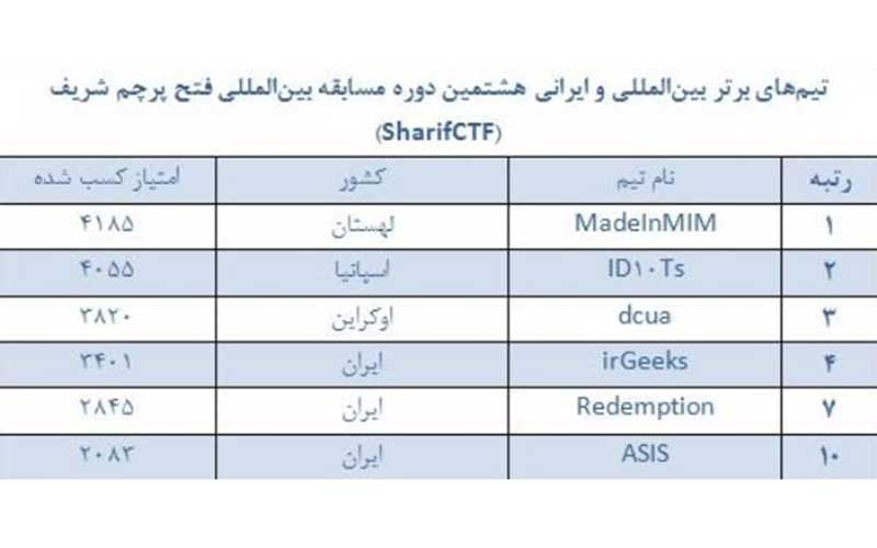 مرکز مدیریت امداد و هماهنگی عملیات رخدادهای رایانه ای نتایج هشتمین دوره مسابقه بینالمللی «فتح پرچم شریف» (SharifCTF) از مجموعه رقابتهای نفوذ و دفاع در فضای مجازی را منتشر کرد.