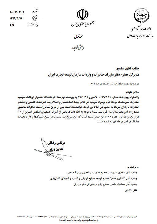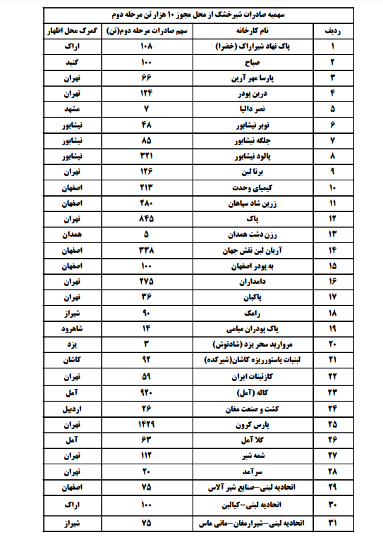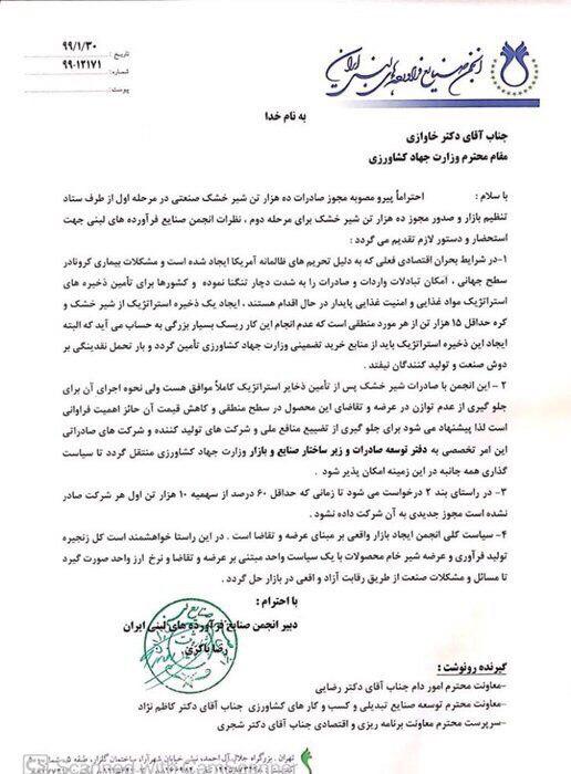 ولی آن‌ گروه از شرکت‌های لبنی که منافع‌شان در واردات کره با ارز دولتی است مجدد با رایزنی های خود با وزارت صمت اقدام به جلوگیری از صادرات ۱۰ هزار تن شیر خشک نموده‌اند که نامه و نحوه سهمیه بندی آن رسما از سوی معاونت دام وزارت جهادکشاورزی به دفتر مقررات صادرات و واردات وزارت صمت زده شده است.