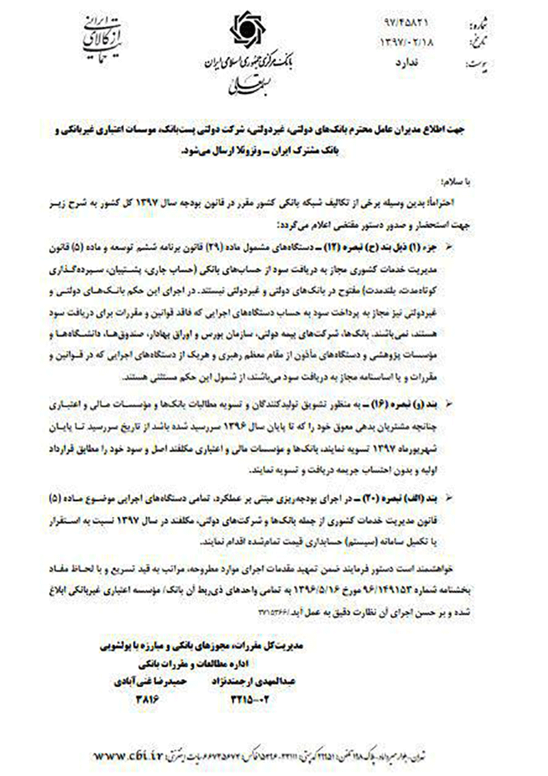 مدیرکل مقررات، مجوزهای بانکی و مبارزه با پولشویی اداره مطالعات و مقررات بانکی بانک مرکزی با ابلاغ ۳ تکلیف مهم بانکی در سال ۹۷، اعلام کرد: دریافت سود حسابهای بانکی توسط برخی دستگاهها ممنوع است.
