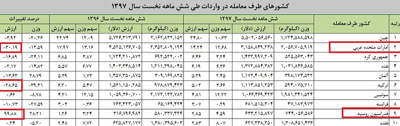 در ۶ ماهه ابتدایی سال جاری واردات از ترکیه و امارات حدود ۳۰ درصد کاهش یافته است.
