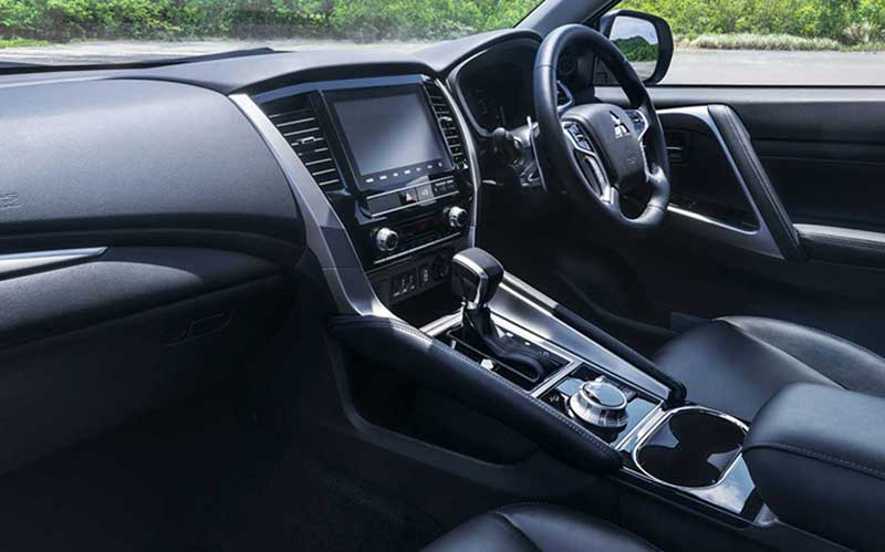 در داخل کابین خودرو برای سیستم سرگرمی و اطلاعات فنی خودرو، از نمایشگر ۸ اینچی استفاده‌شده است. مدل جدید پاجرو اکنون لوکس‌تر از مدل قبلی به‌نظر می‌رسد و از تودوزی جدید بهره می‌برد. سرنشینان عقب هم‌اکنون از خروجی جداگانه‌ی تهویه هوا و درگاه USB بهره می‌برند. برای بازکردن در صندوق از سیستم بدون دست استفاده‌شده و برخی از ویژگی‌های خودرو از طریق تلفن همراه قابل کنترل هستند.