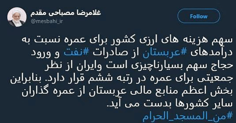 حجتالاسلام غلامرضا مصباحیمقدم عضو مجمع تشخیص مصلحت نظام با انتشار پیامی در توییتر درباره میزان درآمد عربستان از حج عمره ایرانیان نوشت: «سهم هزینههای ارزی کشور برای عمرهع نسبت به درآمدهای عربستان از صادرات نفت و ورود حجاج سهم بسیار ناچیزی است و ایران از نظر جمعیتی برای عمره در رتبه ششم قرار دارد؛ بنابراین بخش اعظم منابع مالی عربستان از عمره گذاران سایر کشورها به دست میآید».