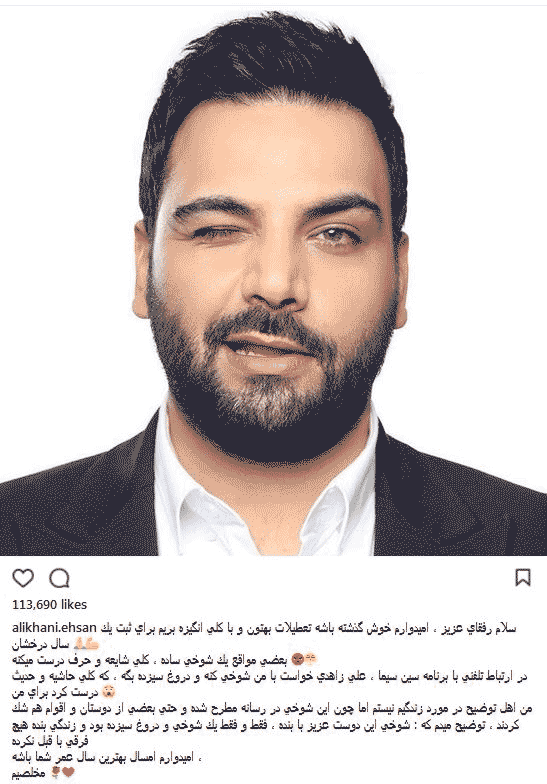 احسان علیخانی مجری و تهیه کننده سینما و تلویزیون در اینستاگرامش توضیحاتی در مورد شایعه و حرف و حدیثهای ایجاد شده پیرامون دروغ سیزده خودش در رسانه ملی داد.