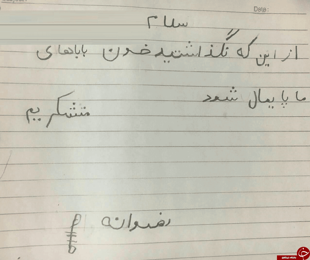 رضوانه باغبانی دختر ۷ساله شهید مدافع حرم در این نامه نوشت: از اینکه نگذاشتید خون باباهای ما پایمال شود، متشکریم.