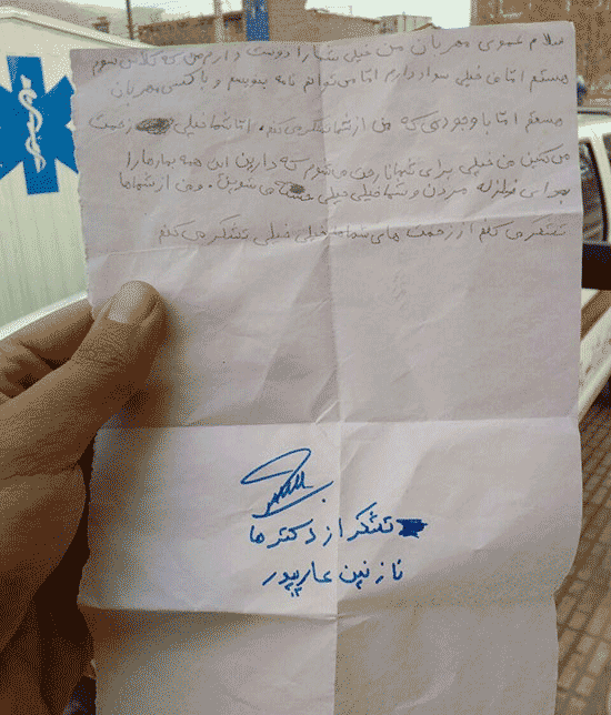 – در عکس زیر نامه تشکر یک کودک زلزله زده سرپل ذهابی را خطاب به یکی از تکنسین های اورژانس مشاهده می کنید.