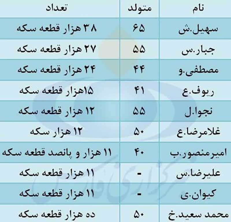 ۱- در صدر این لیست جوانی متولد سال ۶۵ به نام «سهیل.ش» قرار دارد که بیش از ۳۸ هزار عدد سکه خریداری کرده است یعنی رقمی حدود ۵۵ میلیارد تومان.