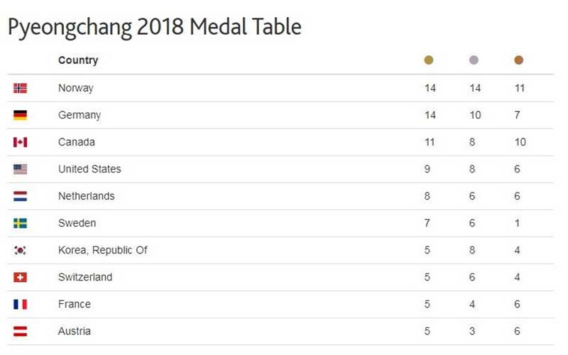 نروژ در صدر جدول مدالآوران قرار گرفت