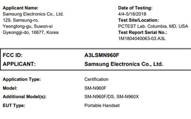 کمیسیون ارتباطات فدرال ایالات متحده (FCC) برای گوشی هوشمند سامسونگ با شماره مدل SM-N960F تأییدیه صادر کرد. از آنجایی که شماره مدل مشخصشده با گوشیهای قبلی سری گلکسی نوت سامسونگ مطابقت دارد، انتظار داریم تأییدیه مربوط به گوشی سامسونگ گلکسی نوت ۹ باشد. شماره مدل گلکسی نوت ۸ سامسونگ که سال گذشته میلادی رونمایی شد، SM-N950 بود.