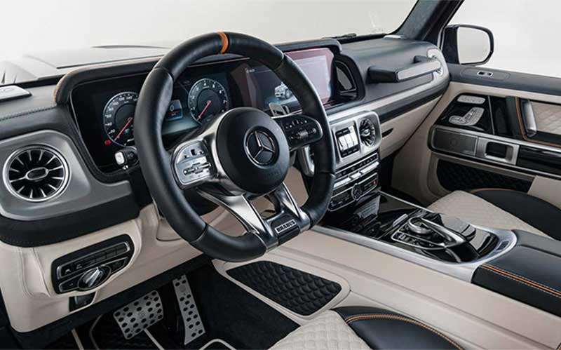نورپردازی LED کابین، نشان مخصوص برابوس، تزئینات سپر عقب و جلو با رنگ سیاه، بالهی سقفی و چراغهای سقفی و در نهایت رینگهای بزرگ ۲۳ اینچ سفارشی برابوس از دیگر تغییرات G63 است. کابین این شاسیبلند آلمانی که در هر ۱۰۰ کیلومتر ترکیبی شهر و بزرگراه ۱۳.۱ لیتر سوخت مصرف میکند، با ترکیب روکشهای چرم، آلکانترا، تزئینات چوب، فیبرکربن و پدالهای آلومینیومی تعویض دنده در پشت فرمان تغییر پیدا کرده است.