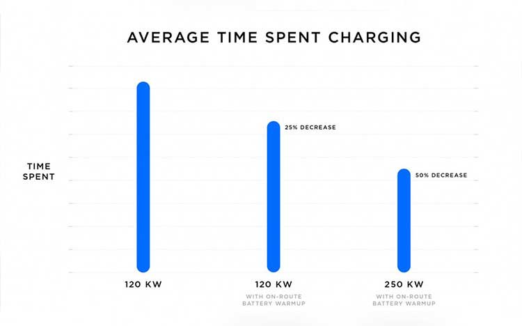 اما اکنون در اینجا نسل سوم سوپرشارژهای تسلا قادر هستند تنها با مدت ۵ دقیقه شارژ، امکان طی کردن مسافت ۱۲۰ کیلومتر را برای خودرو فراهم آورند. در این مهندسی جدید شارژها از منبع قدرت ۱ مگاواتی به‌صورت جداگانه بهره می‌برند که از باتری‌های بزرگتر تسلا الهام‌گیری شده است. بنابراین قدرت شارژر مخصوص برای هر خودرو، دیگر با شارژر خودرو دیگر تقسیم نخواهد شد و با باتری با بیشترین نرخ ممکن و در سریع‌ترین زمان شار‌ژ می‌شود. به‌منطور سرعت‌دهی بیشتر روند شارژ، تسلا از تکنولوژی هوشمندانه‌ای با نام On-Route Battery Warmup استفاده خواهد کرد.