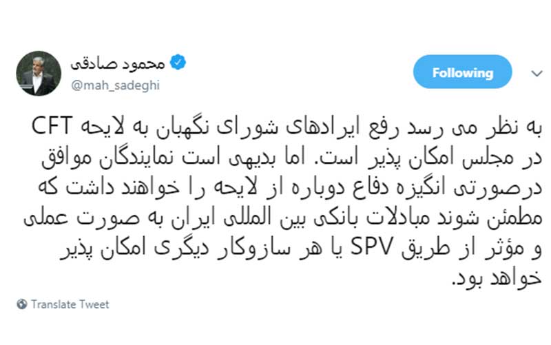محمود صادقی نماینده مردم تهران و عضو فراکسیون امید مجلس شورای اسلامی، در صفحه شخصی خود نسبت به لایحه الحاق جمهوری اسلامی ایران به کنوانسیون مبارزه با تامین مالی تروریسم (CFT) مطلبی منتشر کرده است که متن آن به شرح زیر است: