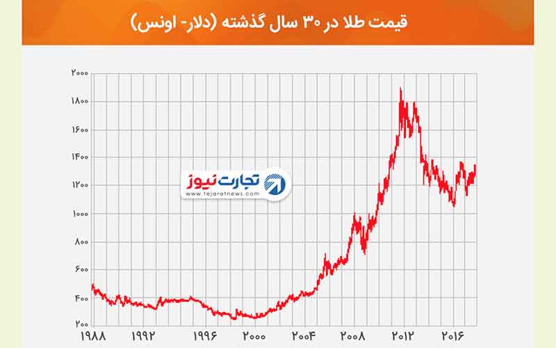 این نمودار روند قیمت طلای جهانی را در سی سال گذشته نشان میدهد.
