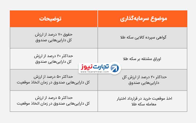 حداقل ۷۰ درصد وجوه موجود در صندوق، به خرید گواهی سپرده کالایی سکه طلا، اختصاص مییابد.