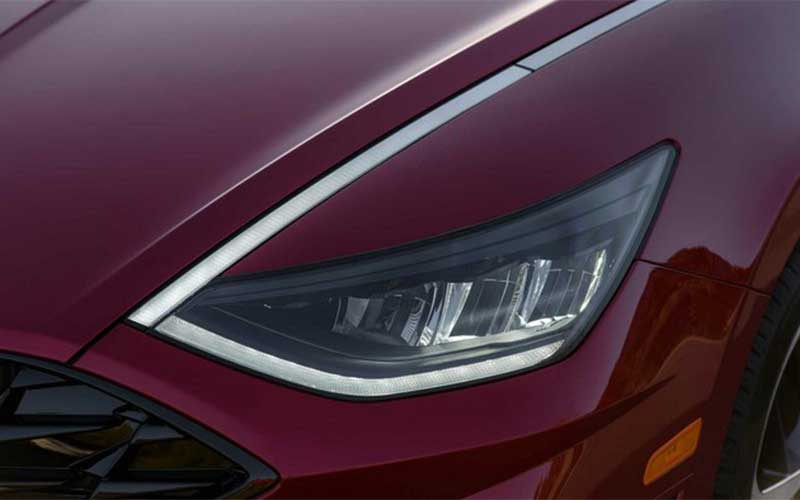 یکی از جذابترین قسمتهای سوناتا چراغهای جلوی آن هستند. بسیاری این چراغها را به چراغهای استون مارتین شبیه میدانند. چراغهای روشنایی در روز LED این خودرو به شکل یک خط تا روی گلگیر ادامه پیدا کردهاند و در انتها به خط نقرهای رنگی که تا آینههای جلو ادامه دارند میرسد. این بخش یکی از جالیترین نکاتی است که در طراحی سوناتا وجود دارند.