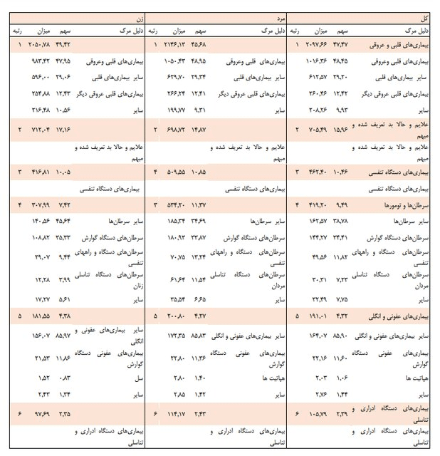 به گفته عباسی، در زنان سومین دلیل ثبت شده با سهم ۱۰.۰۵ درصدی به بیماریهای دستگاه تنفسی اختصاص دارد، در حالی که این دلیل در مردان با سهم ۱۰.۸۵ درصدی در جایگاه چهارم قرار دارد. در سایر دلایل مرگ ثبت شده در مردان و زنان تفاوت در جایگاه رتبهای دیده نمیشود. تنها تفاوت در زیر گروه دلایل مربوط به سرطانها و تومورها و بیمار یهای عفونی و انگلی مشهود است. در گروه سرطانها و تومورها، سه دلیل اول ” سایر سرطانها “سرطانهای دستگاه گوارش و سرطان دستگاه و راههای تنفسی” مشترک بین مردان و زنان و رتبه های اول تا سوم را به خود اختصاص میدهند.
